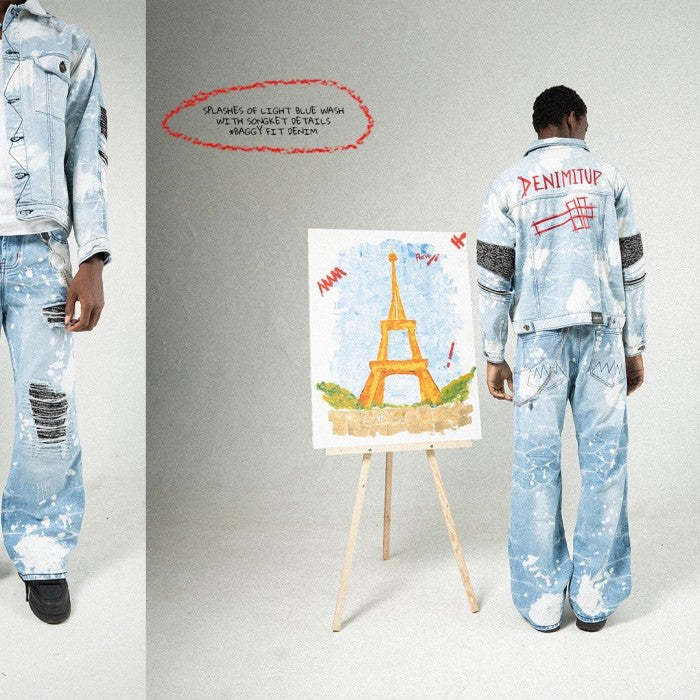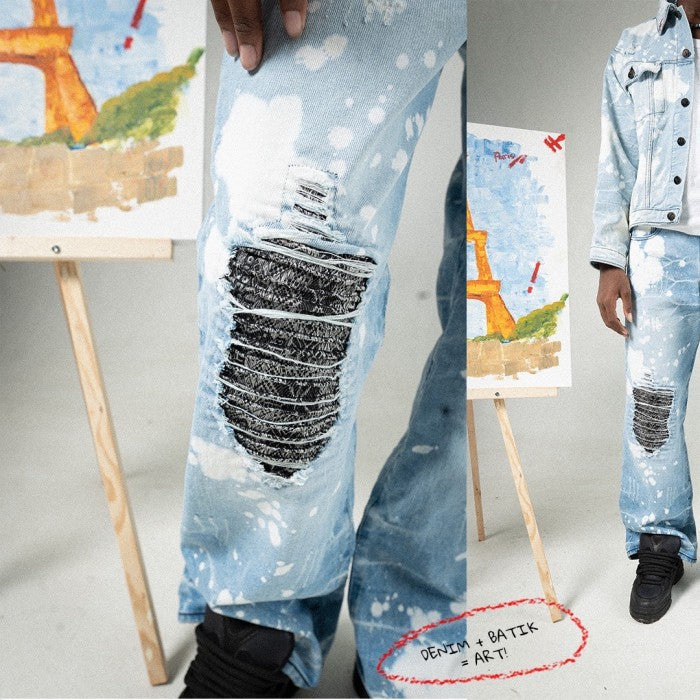 • Distressed areas covered with songket (traditional Indonesian fabric) with biker stitch patch details