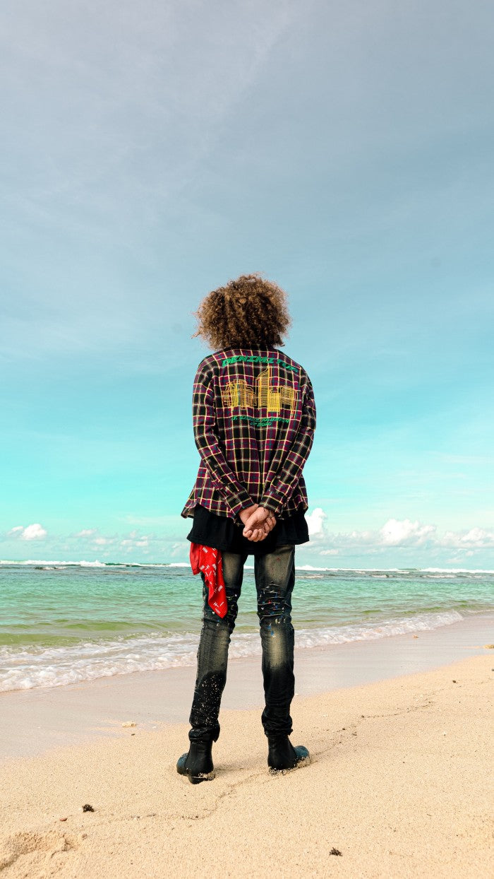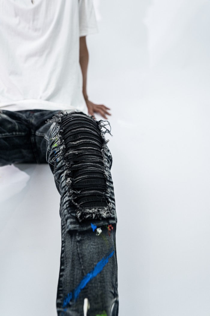 These jeans are crafted with biker-inspired accents, where patches are applied to the distressed areas. The rips and artistic splatters are meticulously created by Indonesian artisans.