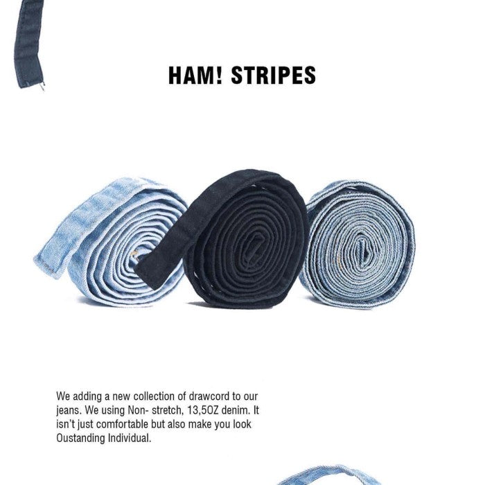 Some pants from HAM! feature additional accessories like these draw cords. The cords are made from 2 meters of non-stretch denim material.