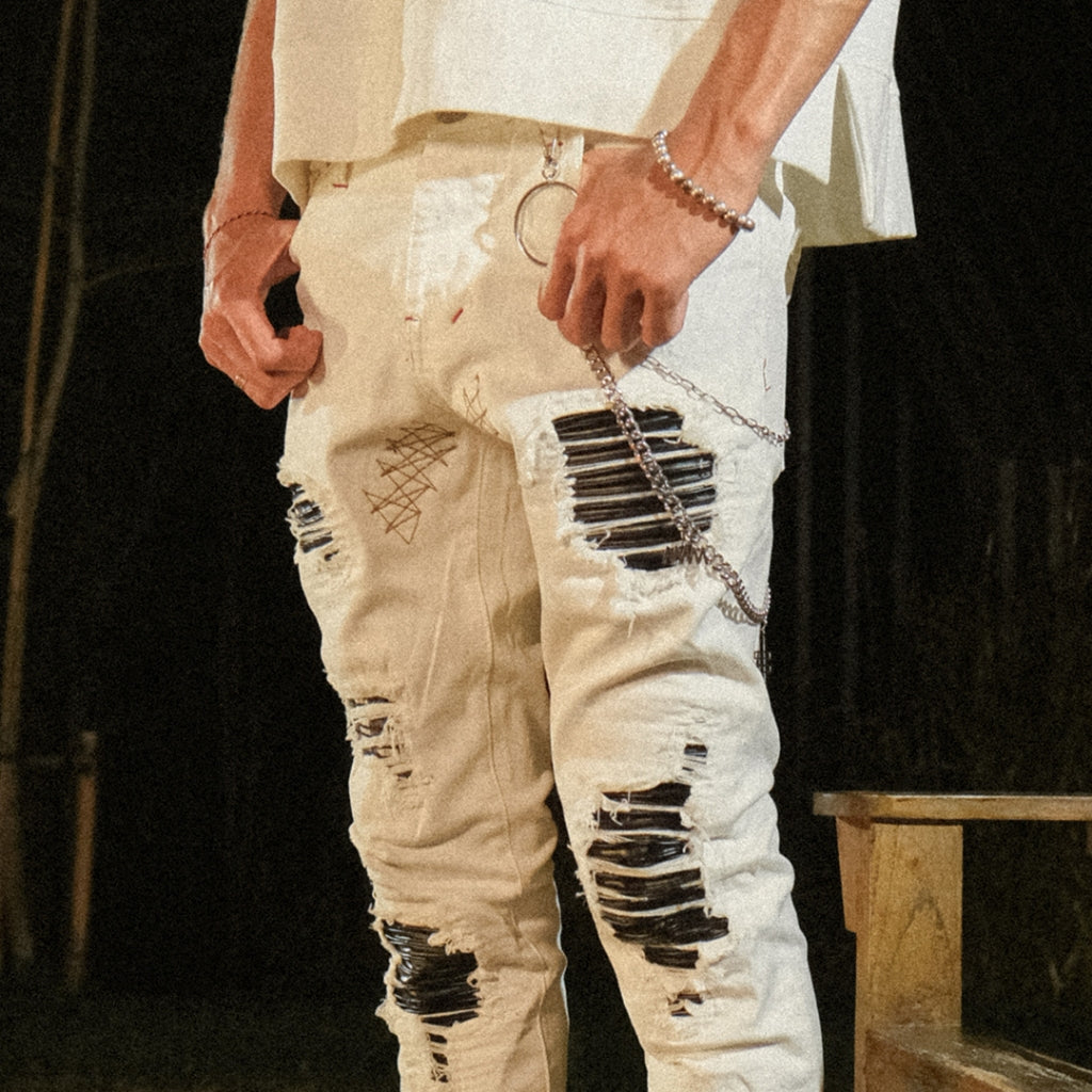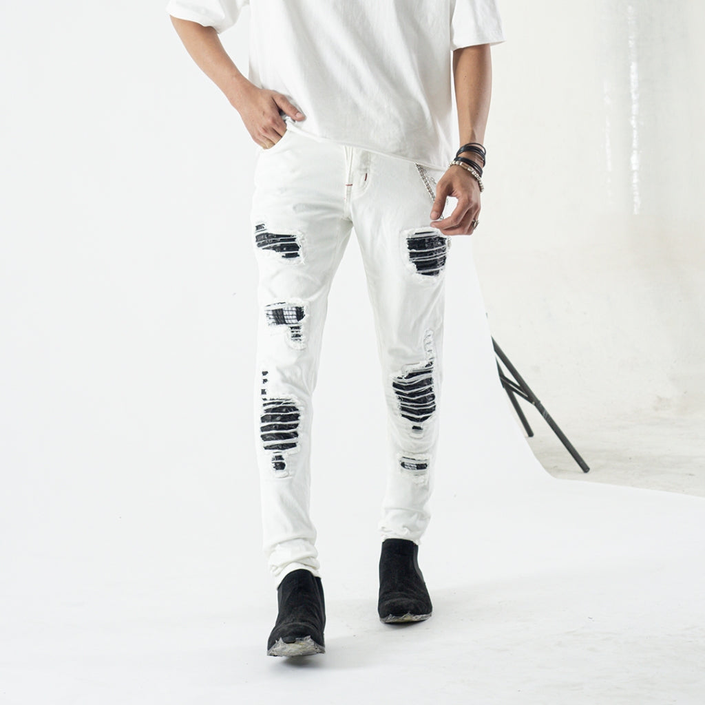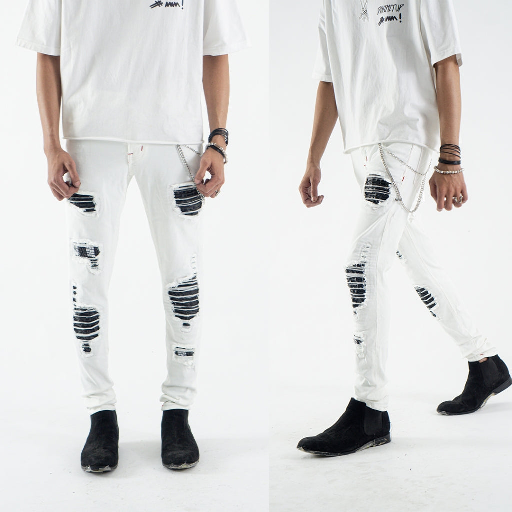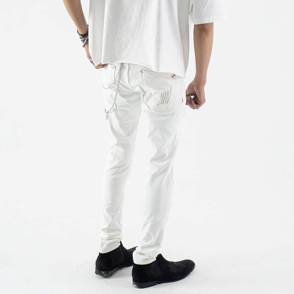 This biker series features three patch points on distressed areas. The biker accents are covered with raised stitching, a signature of biker fashion, and are frayed for a unique touch.