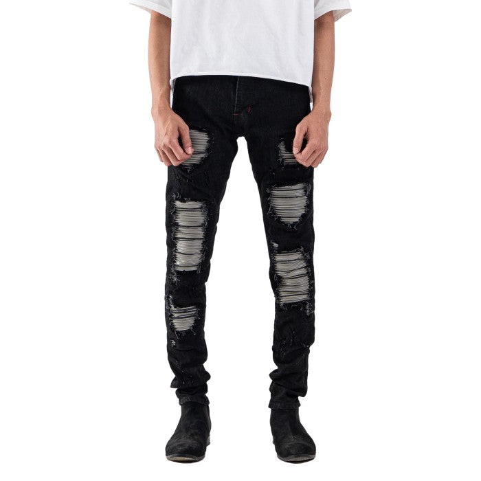 Crafted with a biker-inspired design featuring patches inside the distressed areas of the jeans. The distressing is handmade by Indonesian artisans.