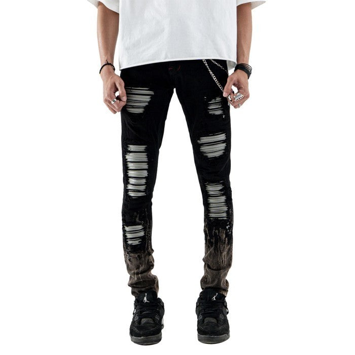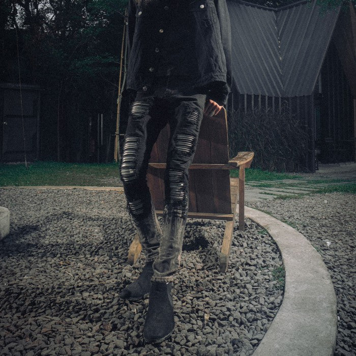 Crafted with a biker-inspired design featuring patches inside the distressed areas of the jeans. The distressing is handmade by Indonesian artisans.