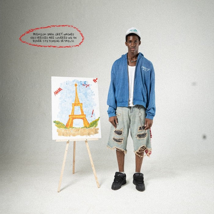 • Prewash effect with whiskers and distress details.