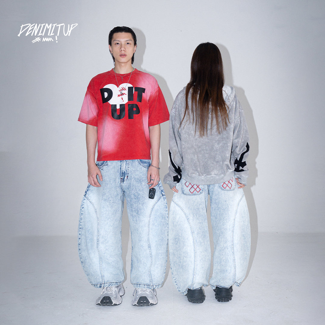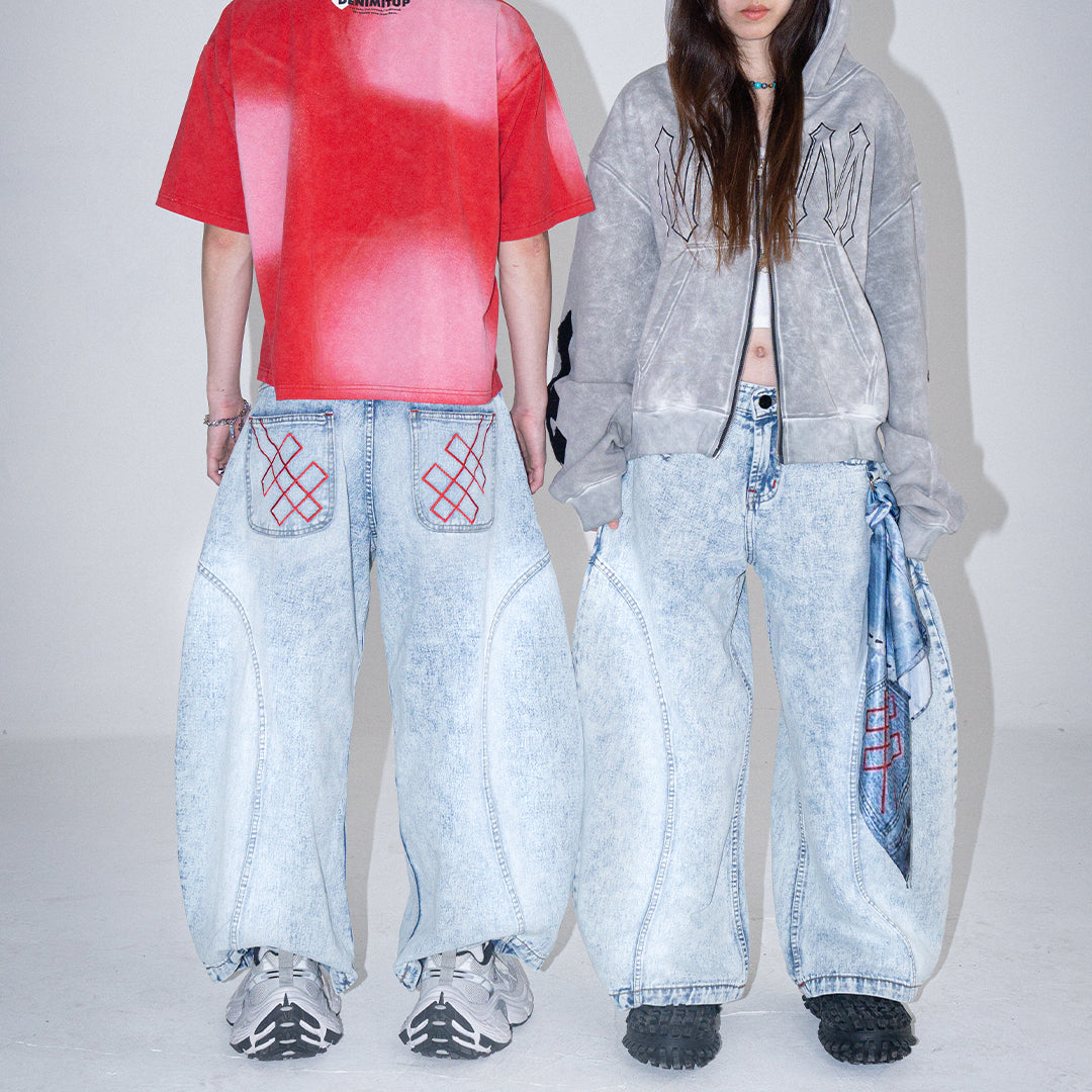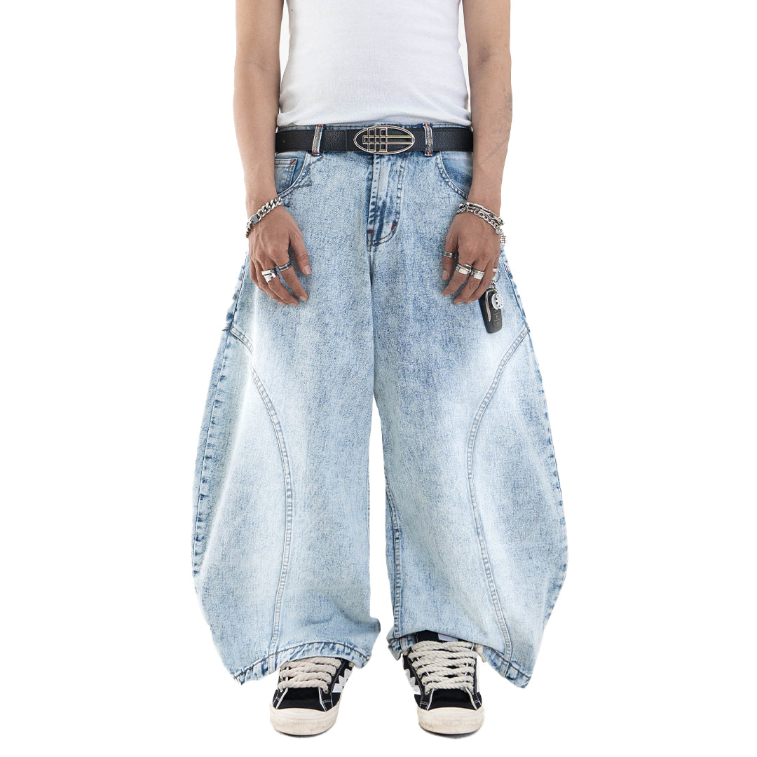 This pair features a boldly curvy barrel cut with an extra-wide silhouette. The leg opening stretches beyond 30cm, but don’t worry — we’ve integrated a smart detail: a hidden slit at the hem that allows your foot to slip through easily, preventing your jeans from getting stepped on.