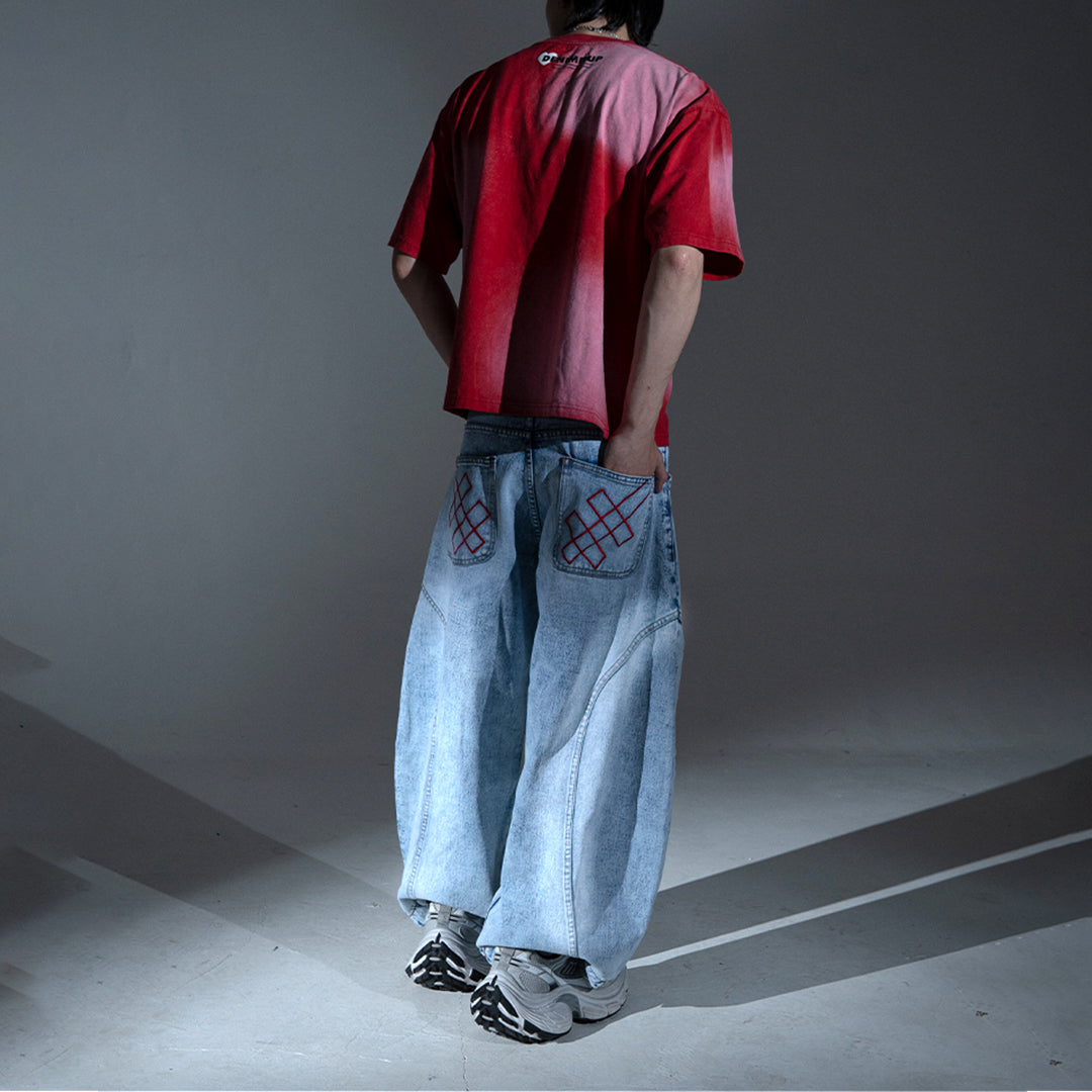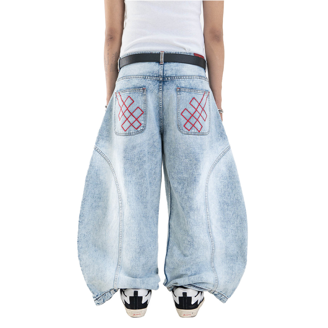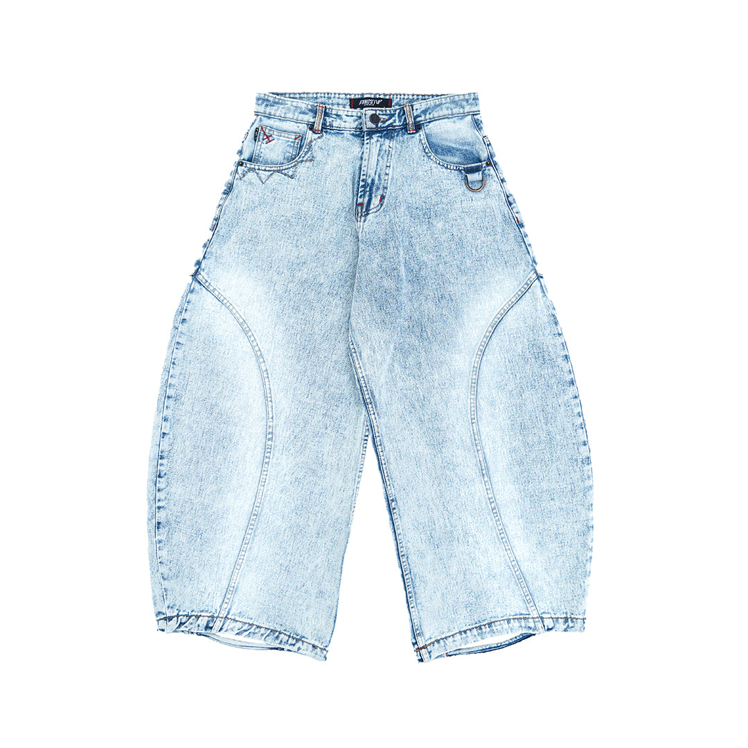 This pair features a boldly curvy barrel cut with an extra-wide silhouette. The leg opening stretches beyond 30cm, but don’t worry — we’ve integrated a smart detail: a hidden slit at the hem that allows your foot to slip through easily, preventing your jeans from getting stepped on.