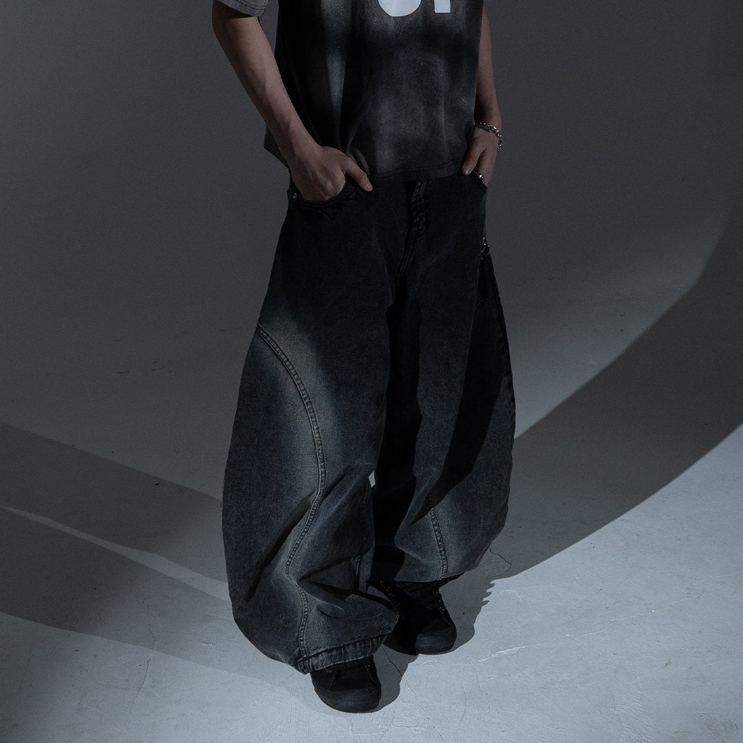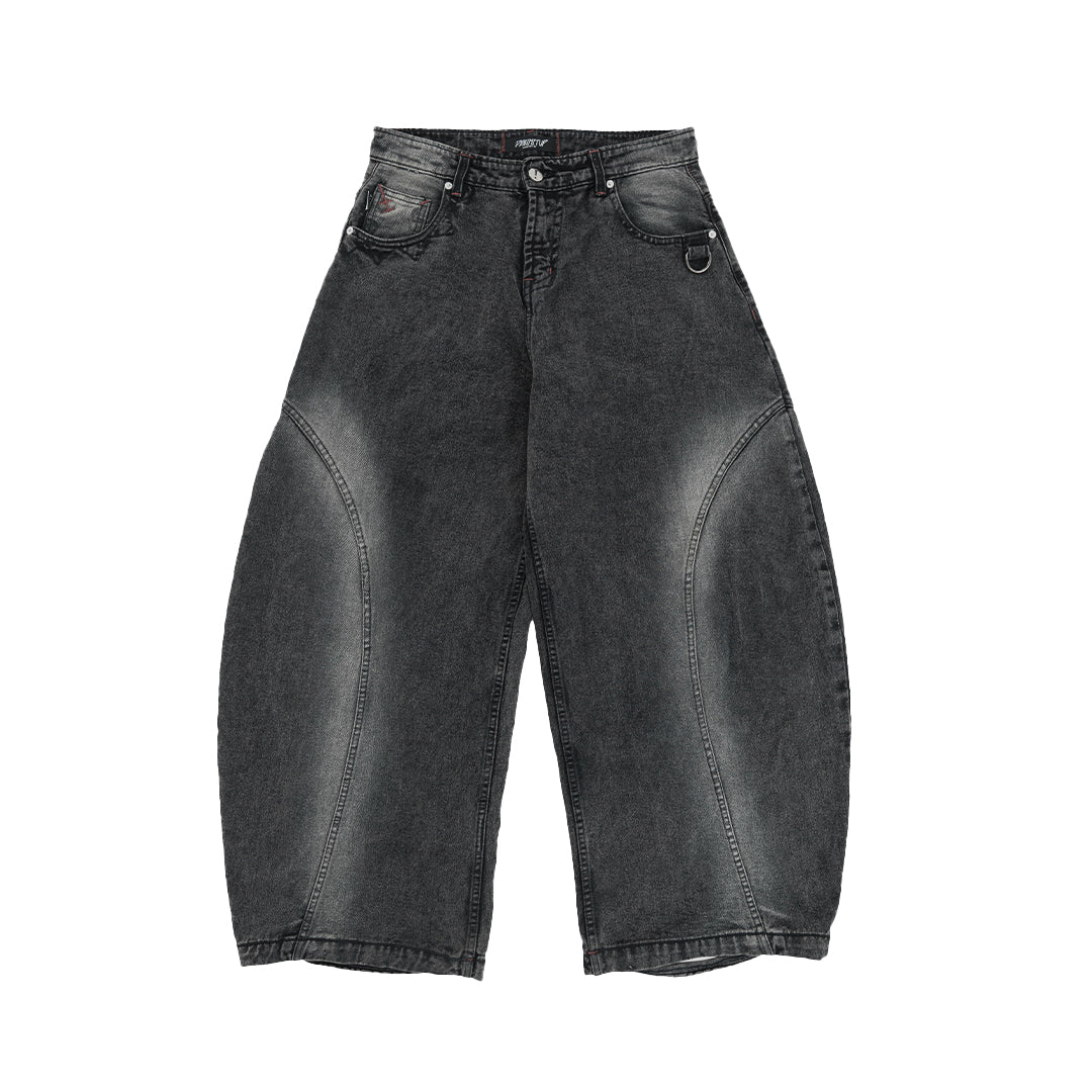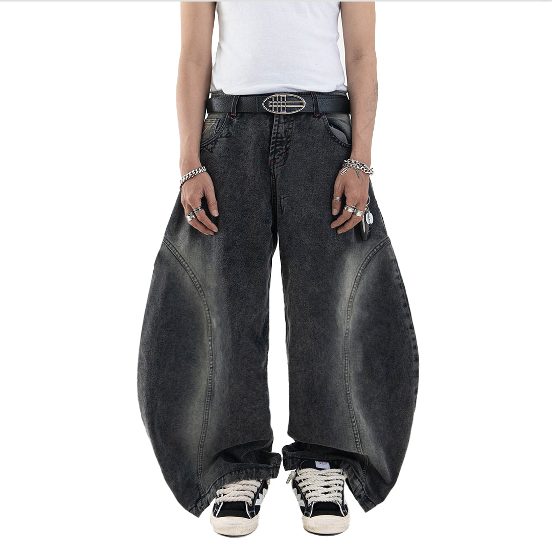 This pair features a boldly curvy barrel cut with an extra-wide silhouette. The leg opening stretches beyond 30cm, but don’t worry — we’ve integrated a smart detail: a hidden slit at the hem that allows your foot to slip through easily, preventing your jeans from getting stepped on.