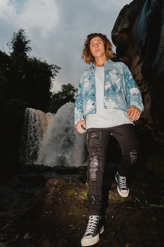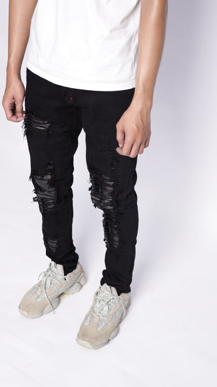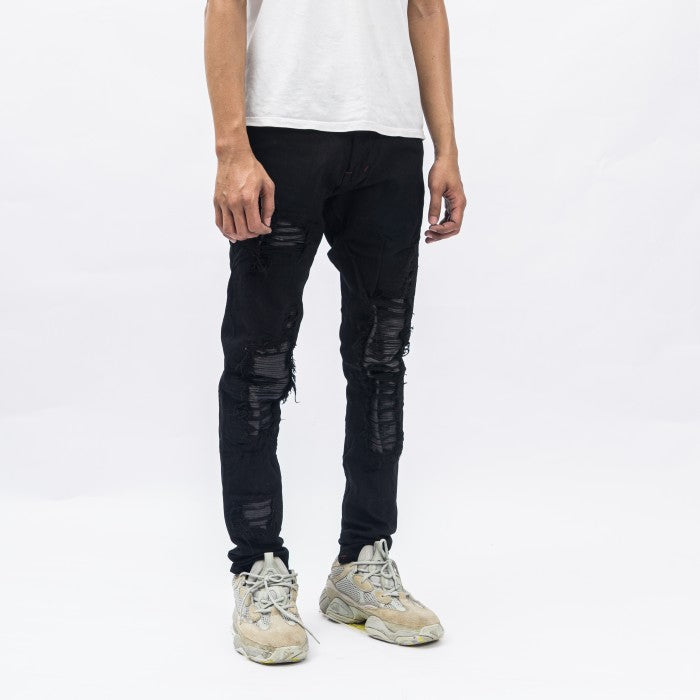 Designed with a biker style featuring patches inside the distressed areas of the jeans. The distressing is handcrafted by Indonesian artisans.